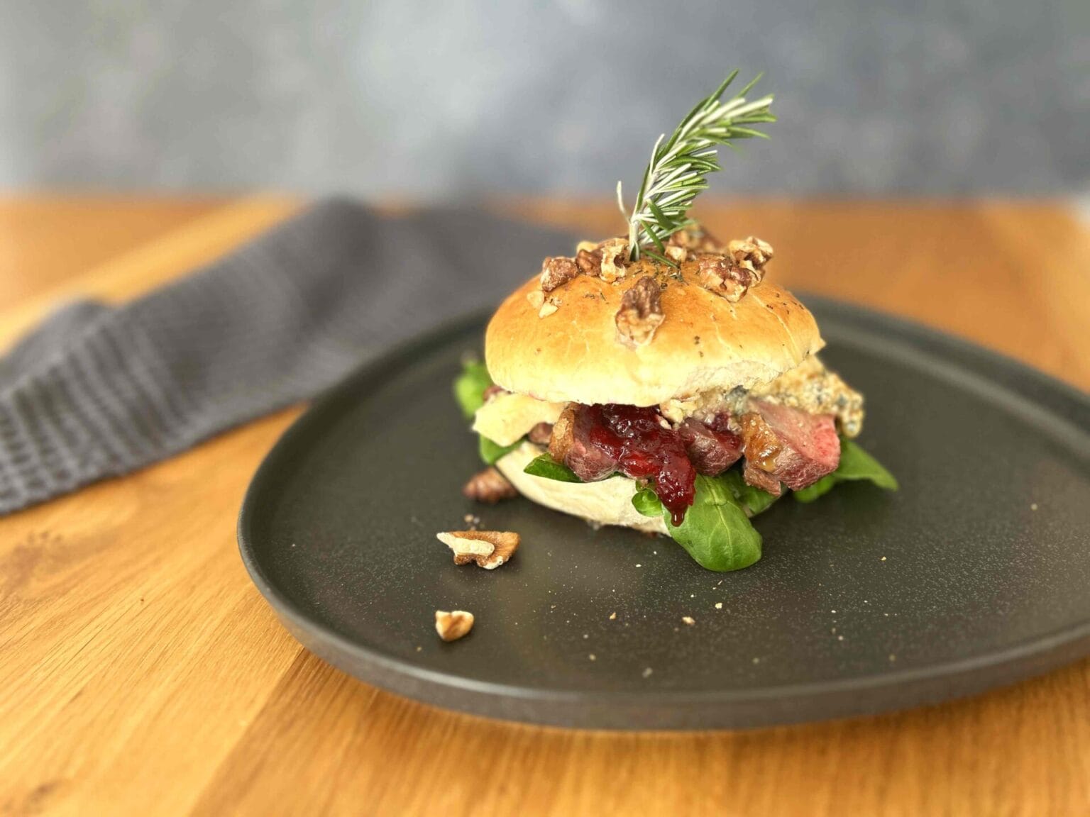 Festtagsburger mit Entenbrust und Cranberry-Gin-Soße