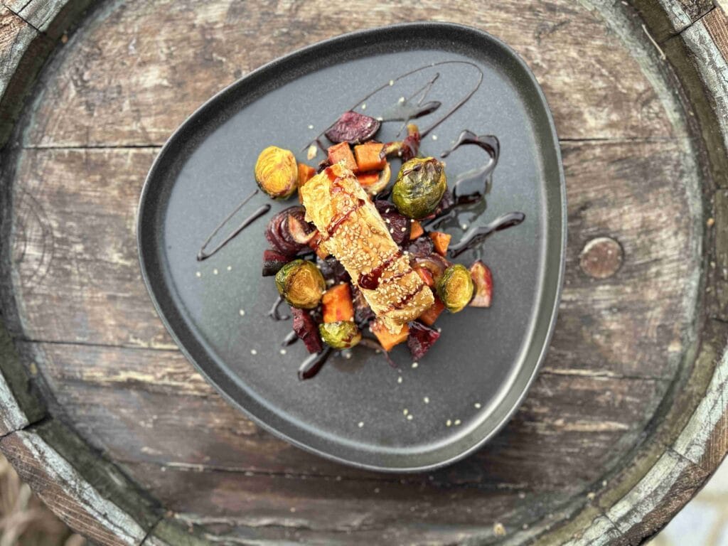 Geräucherter Halloumi im Blätterteigmantel auf Wintergemüse